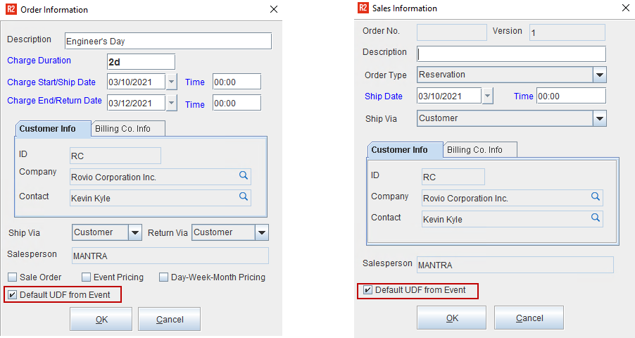 4. Default UDF from Event checkbox displays in Order Information dialog box. Clear it, if not required and click OK.