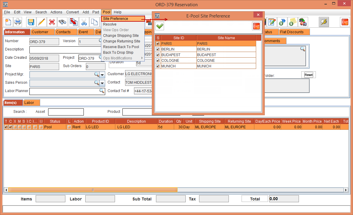 In the Rental Reservation Order [ORD-379], select the Pool menu > Site Preference option. The E-Pool Site Preference window is displayed exhibiting the Order level Site Preference, as shown in Figure 2.4.