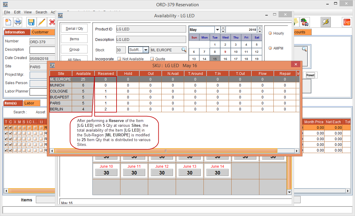 The availability of the Item [LG LED] in the Sub-Region [ML EUROPE] is displayed as 19, whereas the Item at the Sub-Region [ML EUROPE] level is Reserved to 5 and is Reserved to 2 each at the Sites [BERLIN], [BUDAPEST], and [PARIS], as shown in Figure 4.11.