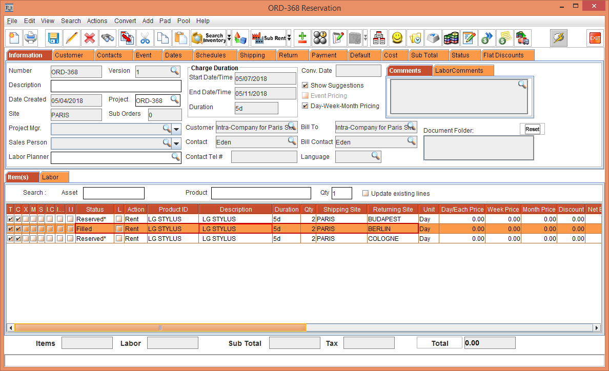 Similarly, when a Sub-Rent for the Item is preformed the Purchase Order for the Shipping Site [BUDAPEST] is created displaying the Site [BUDAPEST] and modifying the Item line Status in the Order [ORD-359] to S-Assign. Also, when a Transfer In for the Item is preformed the Transfer Order for the Shipping Site [BERLIN] is created displaying the Site [BERLIN] and modifying the Item line Status in the Order [ORD-359] to T-Reserved, as shown in Figure 4.7.