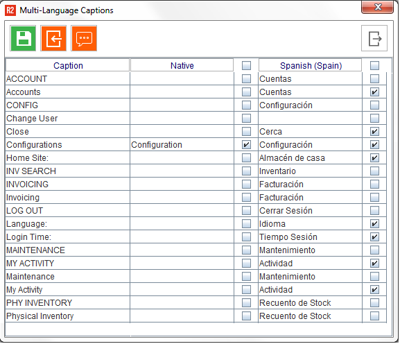 Using this example, the Spanish word for each of the R2 “Captions” is entered into the Spanish column. Later, when the language is changed in R2, the on-screen labels will reflect the language captions.