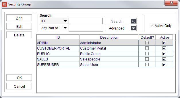 Upon running the Security Access report, R2 will ask you to select a Security Group or click on the OK button to run the report for all Security Groups: