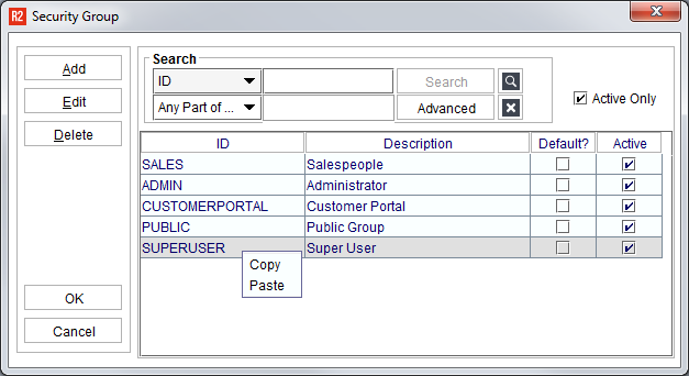 Existing Security Groups can be copied to a new Security Group name. Begin at the Security Group screen then right-click on the Security Group you want to duplicate: