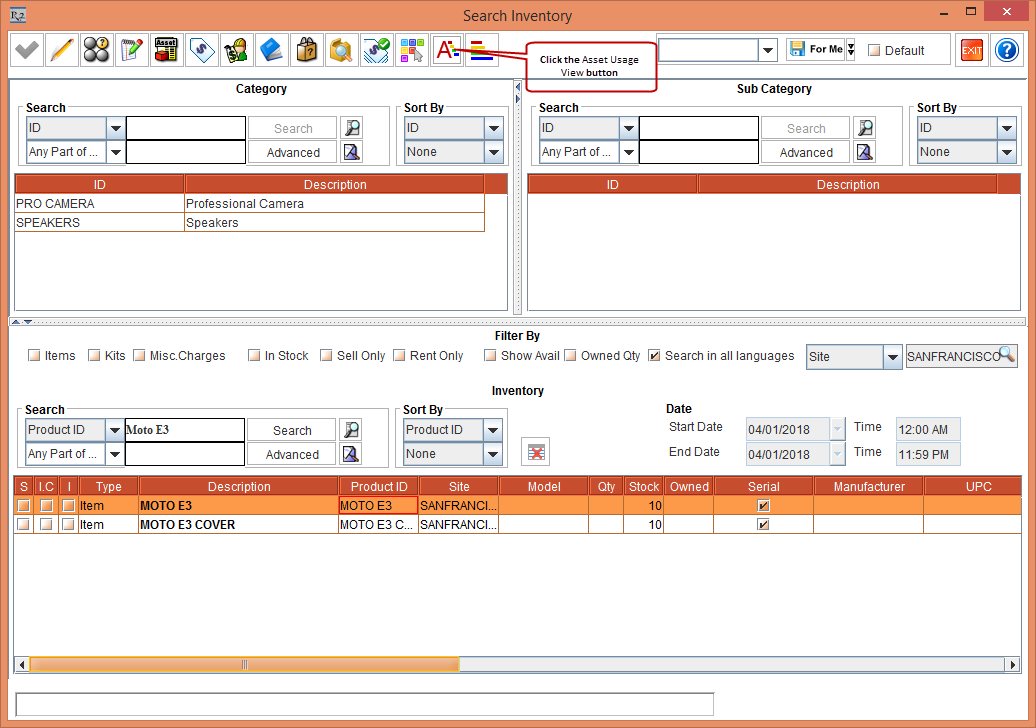 Figure 1.0 Searching Item in the Search Inventory module and selecting Asset Usage View