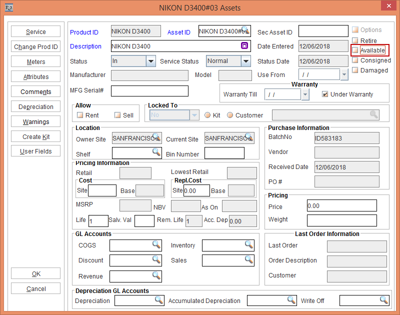 Figure 1.1 Asset [NIKON D3400#03] > Available check box cleared