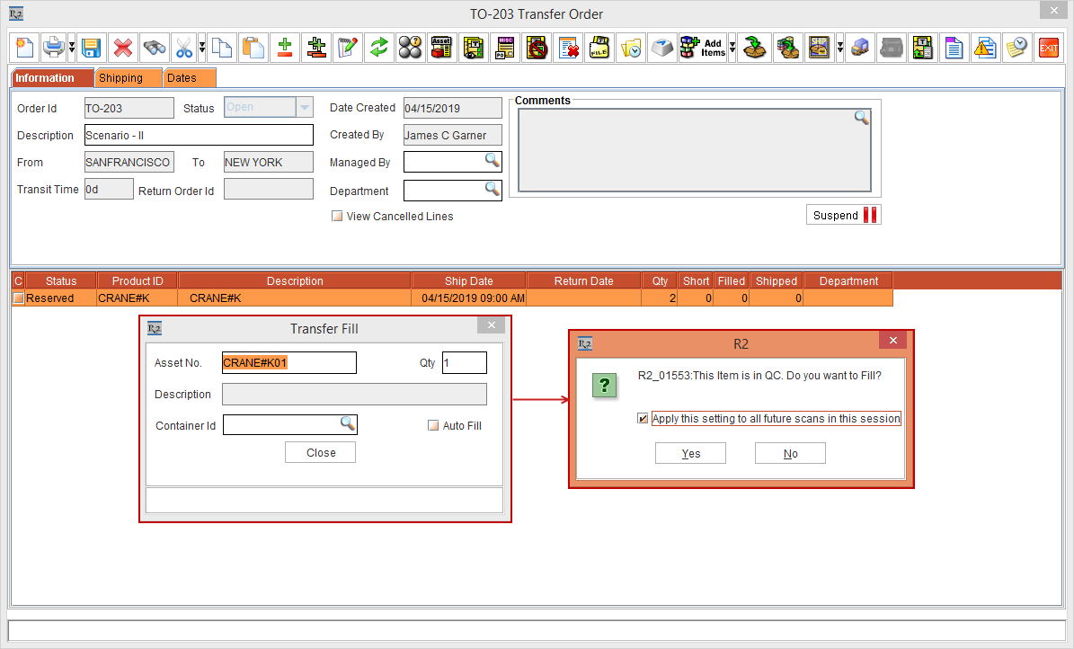 On the Date [15-April- 2019] open the Prep Task of [ORD-1314] and scan the Asset [CRANE#J01] that is in QC Status to fill it. The system displays the message, “R2_10533:This Item is in QC. Do you want to Fill?” with "Apply this setting to all future scans in this session" check box, as shown in the Figure 1.3.