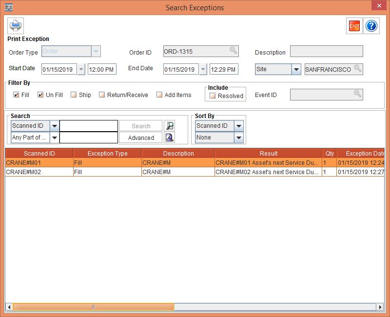 Close the Fill Order window. The system displays the ViewExceptions prompt with the message "R2_00491:Exceptions found during scanning. Do you want to view it now?" with Yes and No buttons.