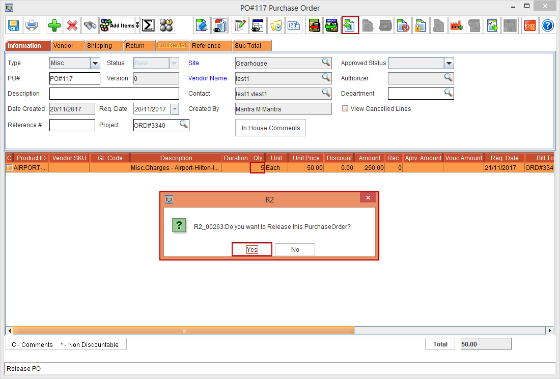 Change the Qty to 5 > click the Release button. A dialog is displayed, as shown in the following Figure 1.3. Click the Yes button. The Purchase Order is released.