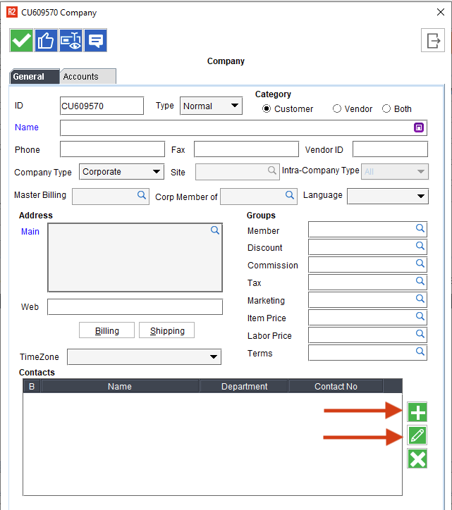 One customer or vendor contact is required when adding a new company record into R2. Click on the Add icon to enter a new contact, or the Edit icon to edit an existing contact.