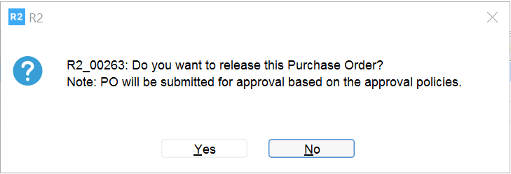 The verification prompt will be displayed. Select the Yes option to release the purchase order. Upon release the purchase order will change to “Open” status.