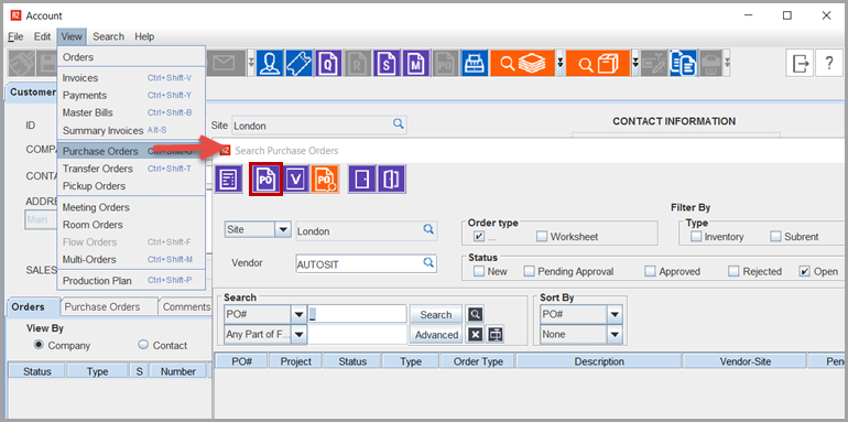 Go to Account > View and select Purchase Orders, to open the PO Search window. Now, click on the Purchase order icon