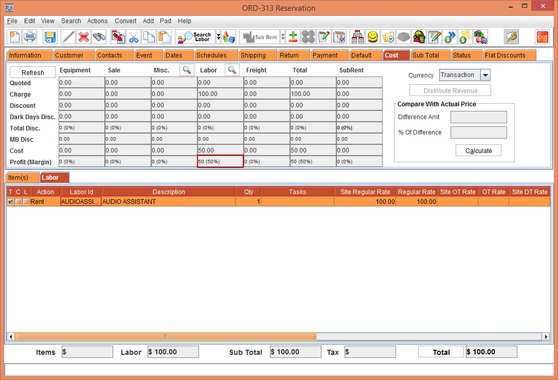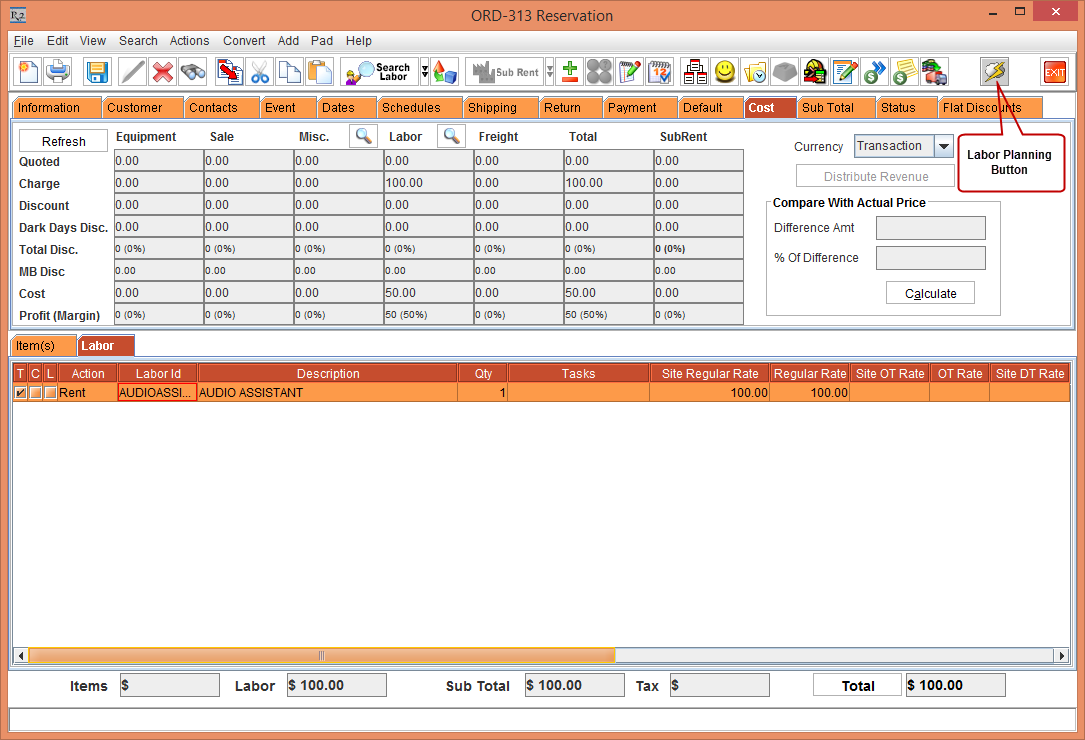 Create a Rental Reservation Order [ORD-312] add the Labor [AUDIOASSIST] to the Order, as shown in Figure 1.0.