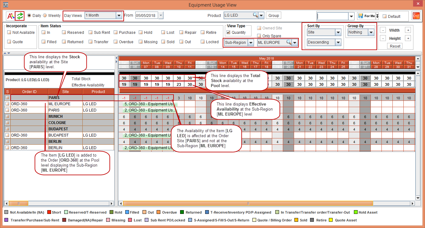 The Pool Status lines in the Equipment Usage View window are displayed only when the Item is filtered for Sub-Region. The availability at the Pool level is not displayed in the Equipment Usage View window if the Item filtered with Site.