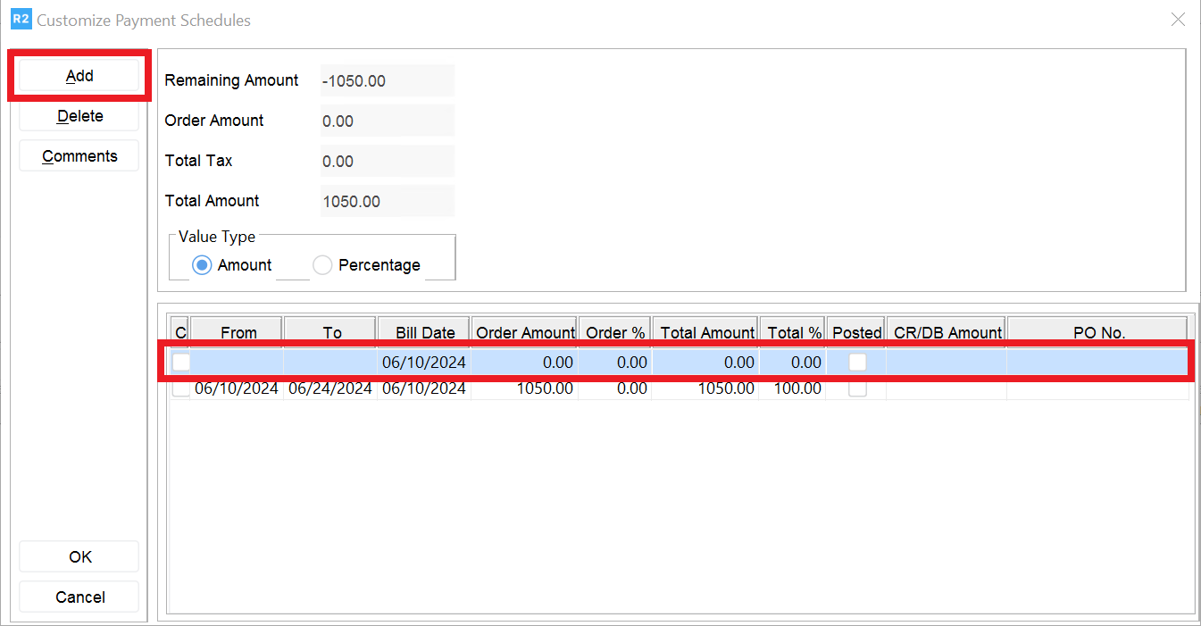 Depending on your Value Type setting, you can enter the Amount for each invoice or the Percentage that each invoice should be of the order amount.