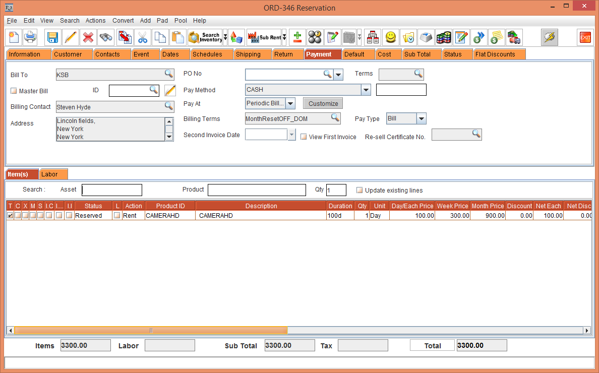 To the Order [ORD-342], add an Item [CAMERAHD] having the Pricing defined as Day Price as 100, Week Price as 300 and Month Price as 900. Observe that the Unit Price is fetched from the Pricing defined in the Item. This is, as shown in the Order as follows: