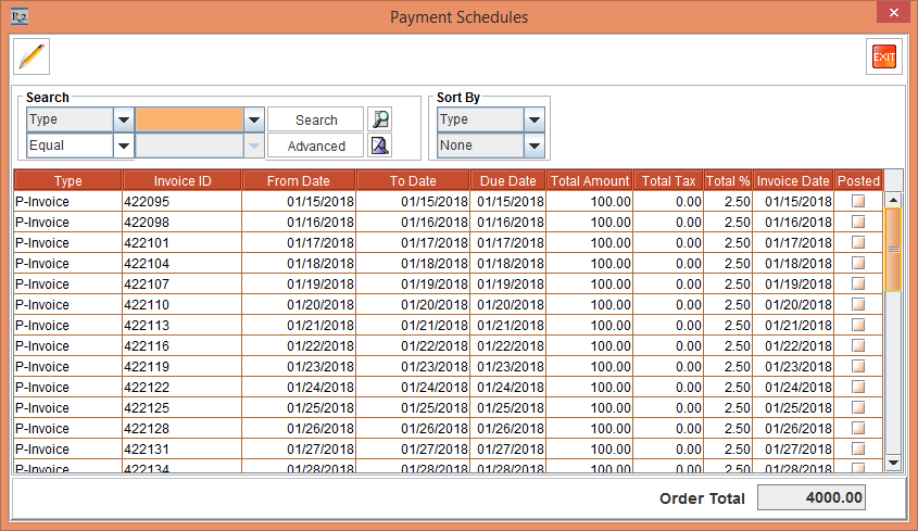 Select the View menu > Payment Schedules option. The Payment Schedules window is displayed. There will be 40 separate Invoices generated for 40 days separately as the Billing is Daily and Reset Billing check box is selected. This is, as shown in the Figure 2.3.