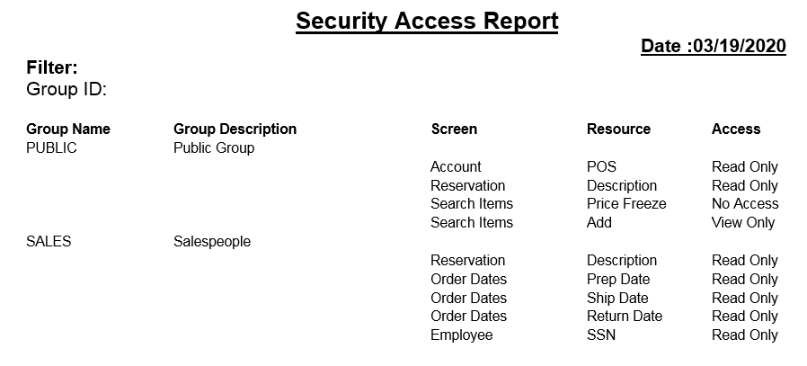 The report shows the Security Group name, Secured Screen, where on the screen (Resource) and what the setting is (Access.)