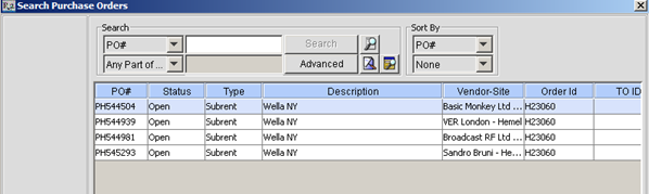 If the Use Existing Purchase Order option was selected, a PO search window will display. Search for the PO and double click on it.