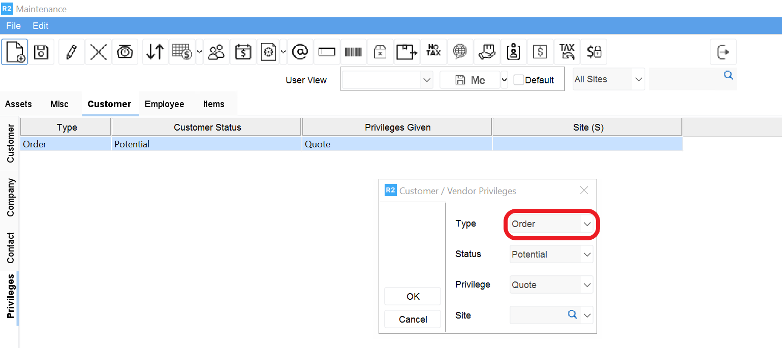 Status and Privilege level will determine allowable order process privilege for a Customer / Vendor in R2.