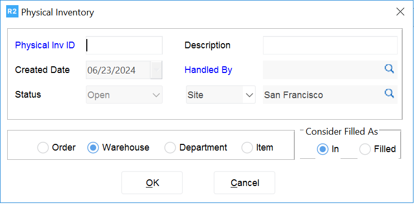 Required fields are: physical inventory id, physical inventory description and the user who is handling the work. These fields can be used to search for a batch later or for reporting purposes. Click on Order, Warehouse, Department or Item