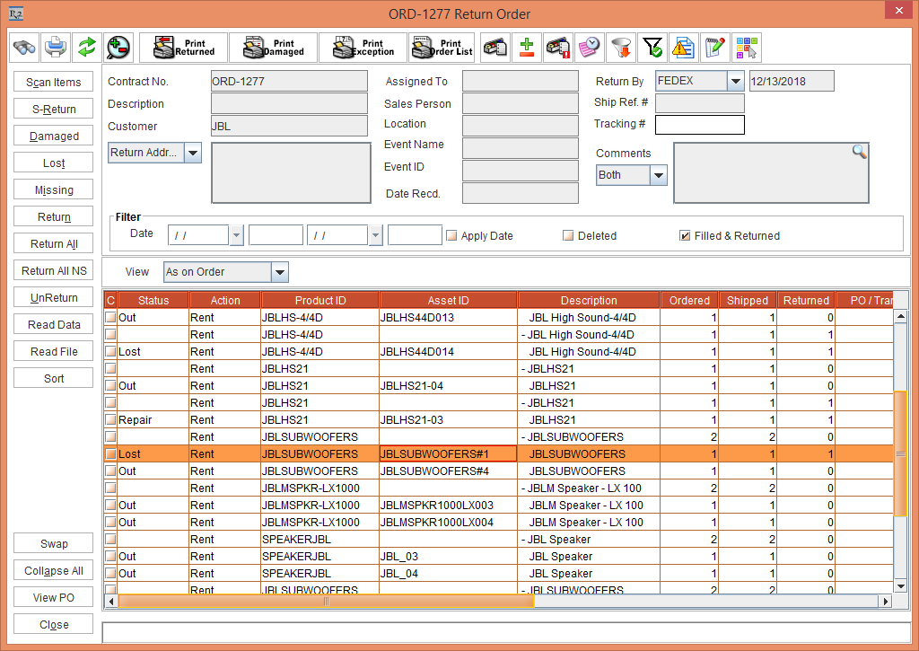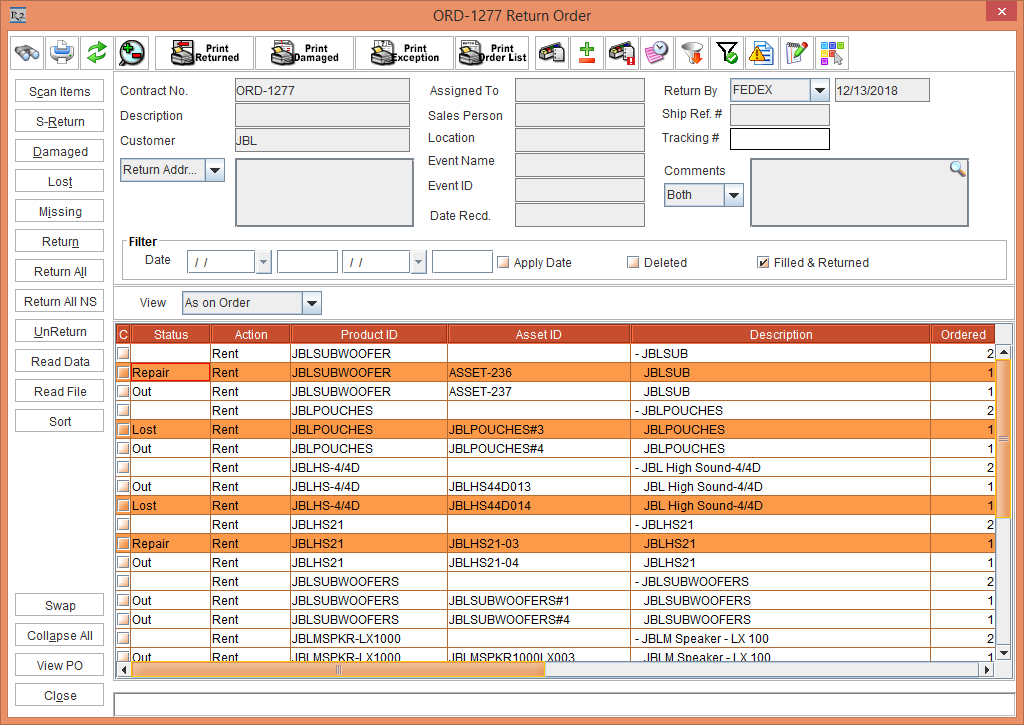 Figure 2.1 Return Order [ORD-1277 Return Order] window > Assets marked as Lost and Repair