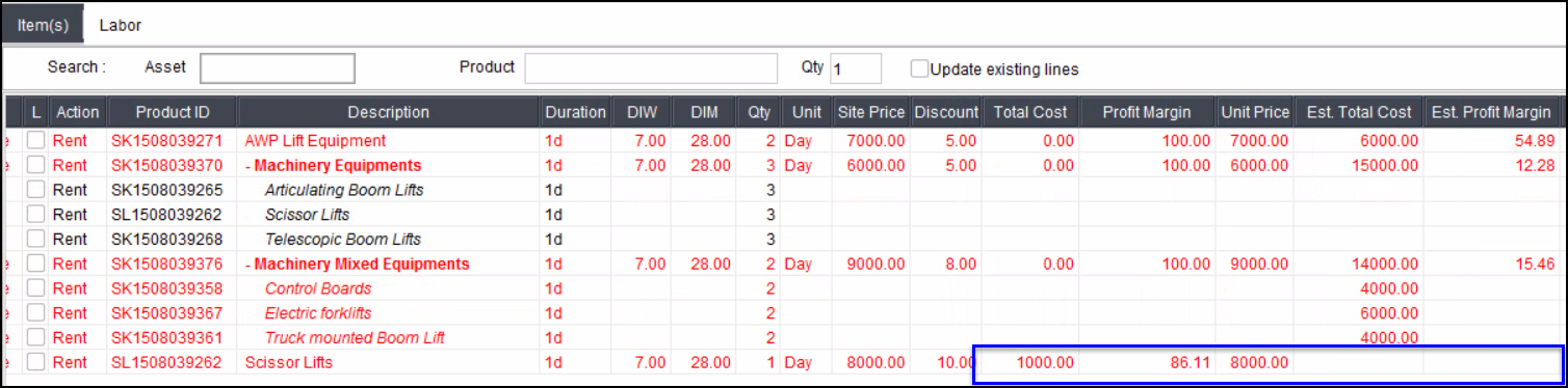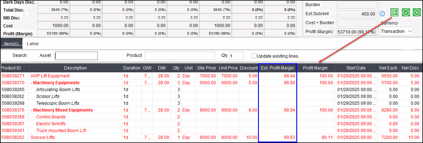 Apply to All Not Available Lines: Applies computed costs to all unavailable lines. Recalculates Profit Margin and Cost + Burden values using applied contract line costs. Est. Subrent Cost, Est. Total Cost, and Est. Profit Margin columns in the item grid for all not available lines are cleared.