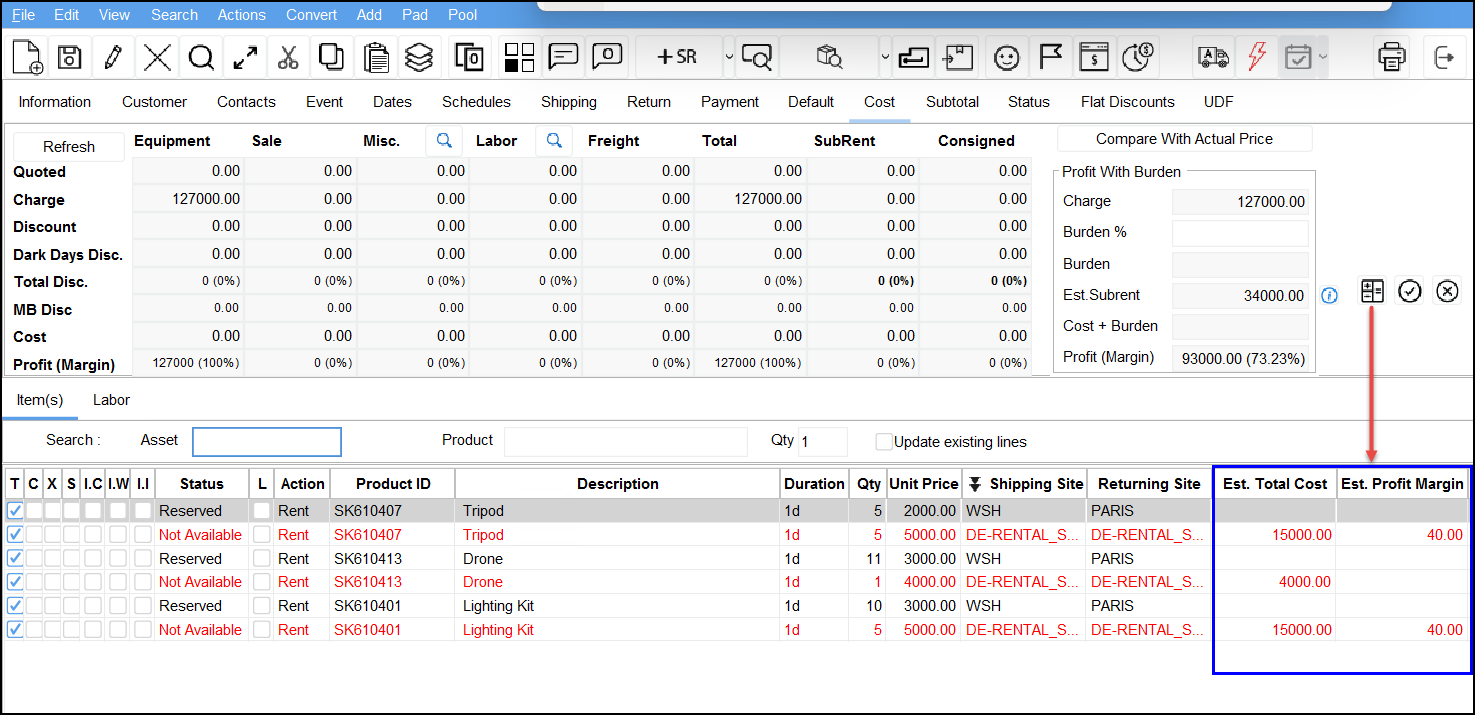 Est. Subrent: Displays the total estimated cost of all unavailable items in the order under the Cost tab.