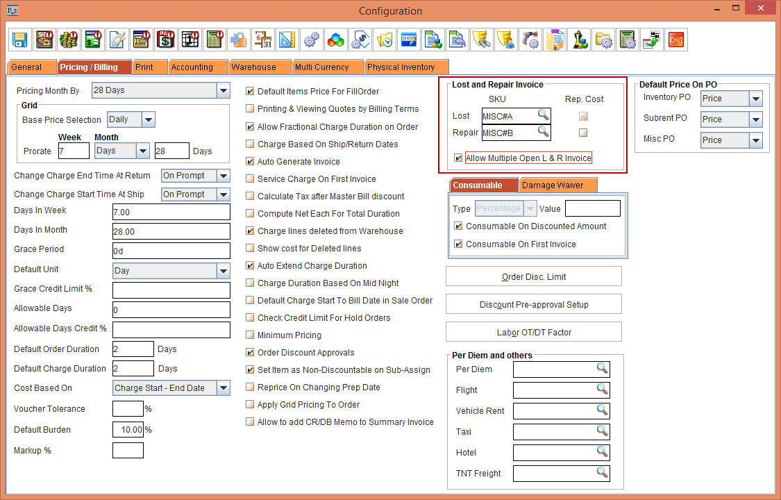 Figure 1.0 Configuration module > Pricing / Billing tab > Lost and Repair Invoice section and Allow Multiple Open L & R Invoice check box