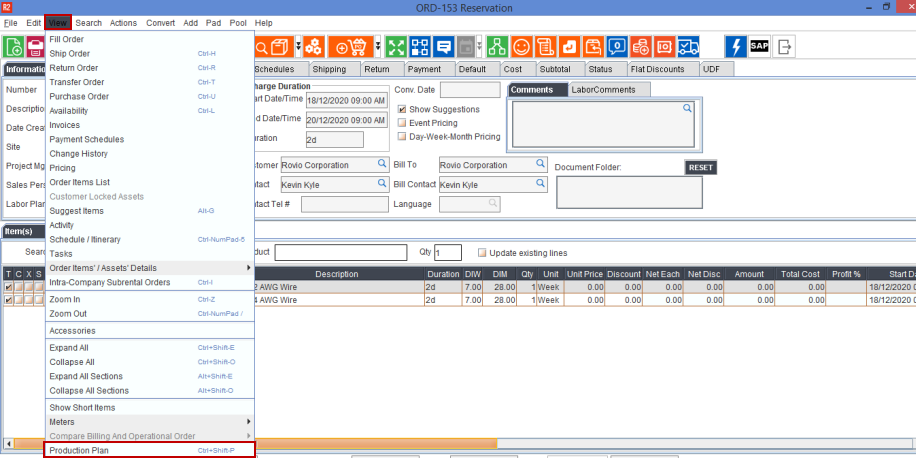 In the Order window, click View > select Production Plan.