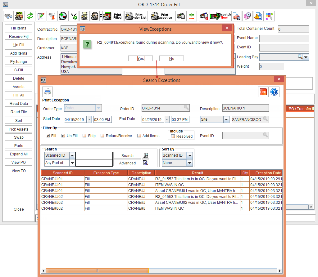 Close the Fill Order window. The system displays the ViewExceptions prompt with the message "R2_00491:Exceptions found during scanning. Do you want to view it now?" with Yes and No buttons.