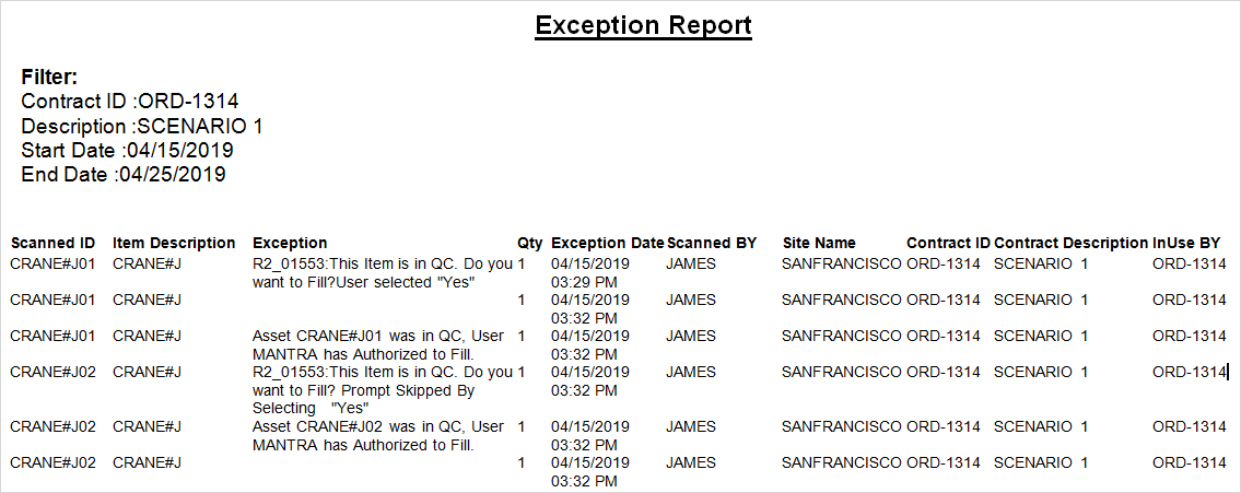 On the Date [15-April- 2019] open the Prep Task of [ORD-1314] and scan the Asset [CRANE#J01] that is in QC Status to fill it. The system displays the message, “R2_10533:This Item is in QC. Do you want to Fill?” with "Apply this setting to all future scans in this session" check box, as shown in the Figure 1.3.