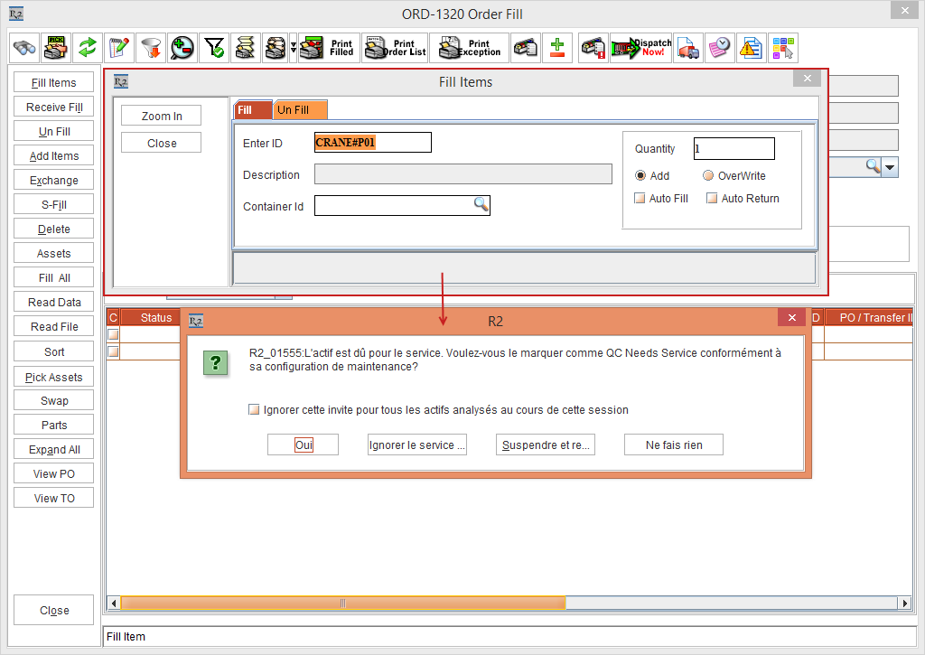 Click OK. The Asset [CRANE#J01] is filled on the Order [ORD-1314] displaying the Fill Items dialog box Status bar message "ITEM WAS IN QC. Item is Filled."