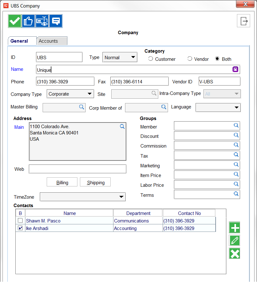 One customer or vendor contact is required when adding a new company record into R2. Click on the Add icon to enter a new contact, or the Edit icon to edit an existing contact.