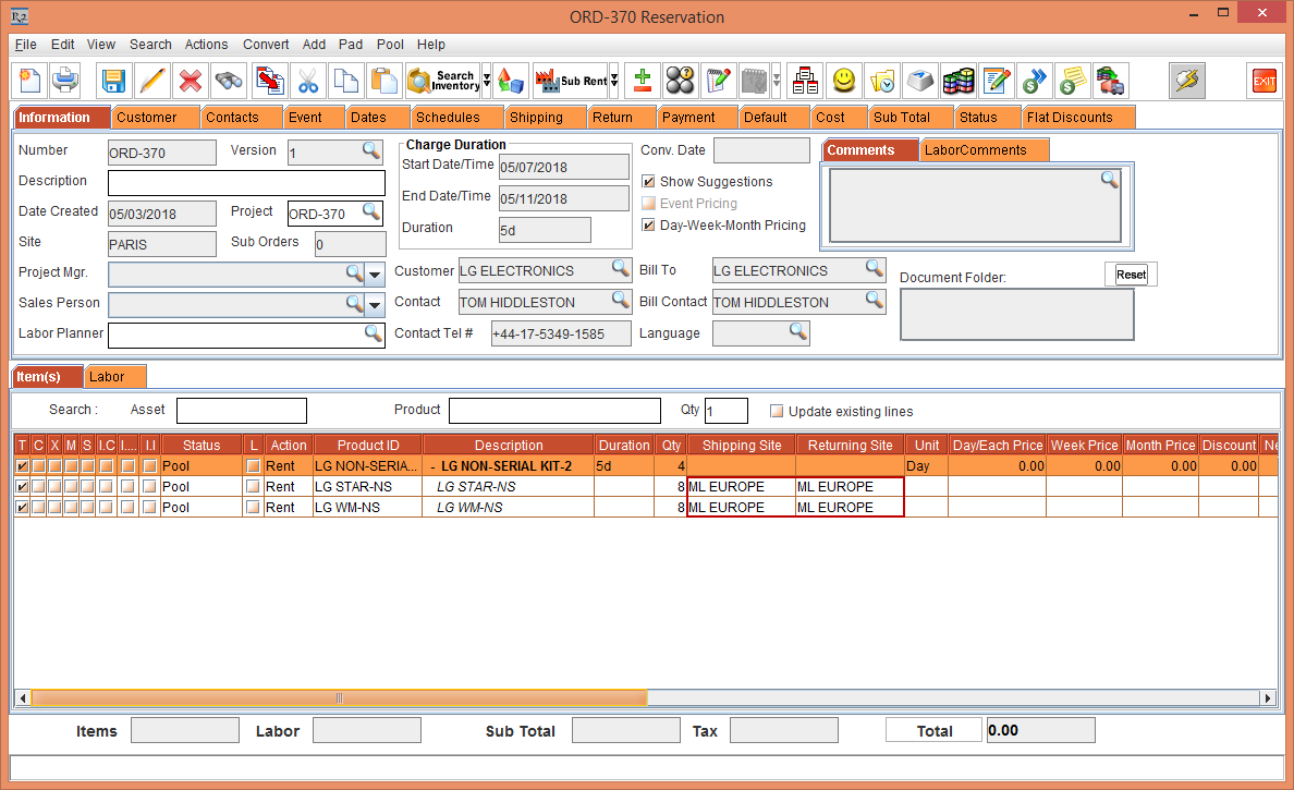 Search and add the Non-Serial Kit [LG NON-SERIAL KIT-2] with 4 Qty. The Kit Header [LG NON-SERIAL KIT-2] will not display any Shipping Site and Returning Site whereas the Child Items [LG WM-NS] and [LG STAR-NS] displays the Shipping Site and Returning Site as Sub-Region [ML EUROPE], as shown in Figure 1.1.