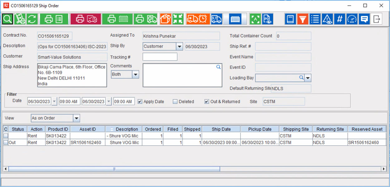 • Ship the Item [Shure VOG Mic] with Assets ID [SR1506162460] and the Status is displayed as Out.