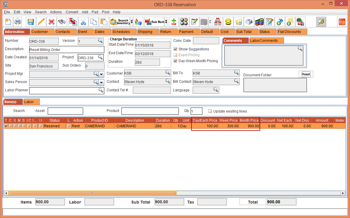 To the Order [ORD-342], add an Item [CAMERAHD] having the Pricing defined as Day Price as 100, Week Price as 300 and Month Price as 900. Observe that the Unit Price is fetched from the Pricing defined in the Item. This is, as shown in the Order as follows: