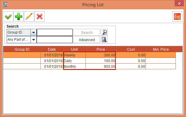 When the Day-Week-Month Pricing check box is selected, the Unit Price, DIW and DIM columns will not be visible.