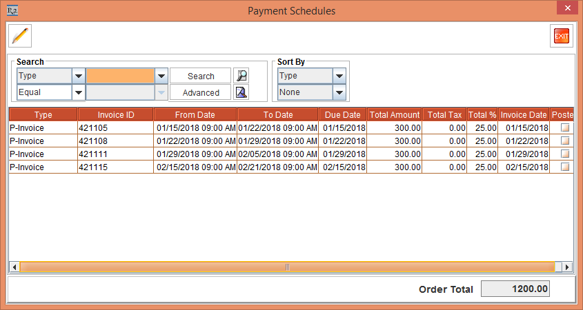 Select the View menu > Payment Schedules option. The Payment Schedules window is displayed. Observe the Invoices generated in Figure 4.32. There are 4 separate Invoices generated.