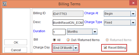 The Reset Billing check box in Billing Terms dialog is available for both Day-Week-Month Pricing selected and when Day-Week-Month Pricing is not selected in Orders.
