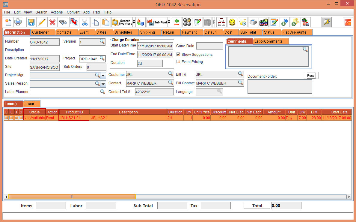 Search and select the Asset [JBLHS21-01] and click OK. The Asset [JBLHS21-01] line is included in the Rental Reservation Order [ORD-1042] with the Status displayed as Not Available, , as shown in Figure 1.3.