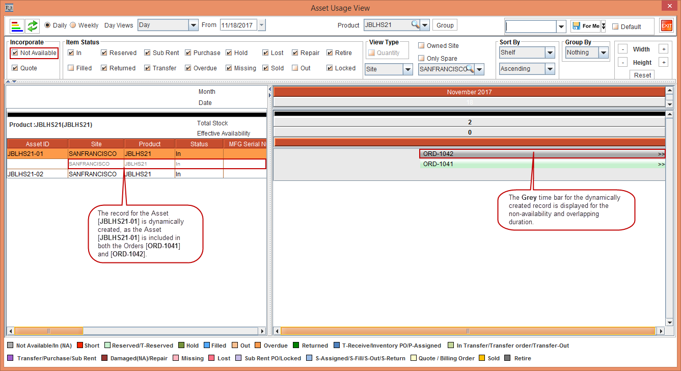 Click the Asset Usage View icon by selecting the Not Available check box within the Asset Usage View - Incorporate section. The record for the Asset [JBLHS21-01] is dynamically created, as the Asset [JBLHS21-01] is included in both the Orders [ORD-1041] and [ORD-1042]. The Asset Usage View for the Asset [JBLHS21-01] with the Grey time bar is displayed for the non-availability and overlapping duration, as shown in Figure 1.4.