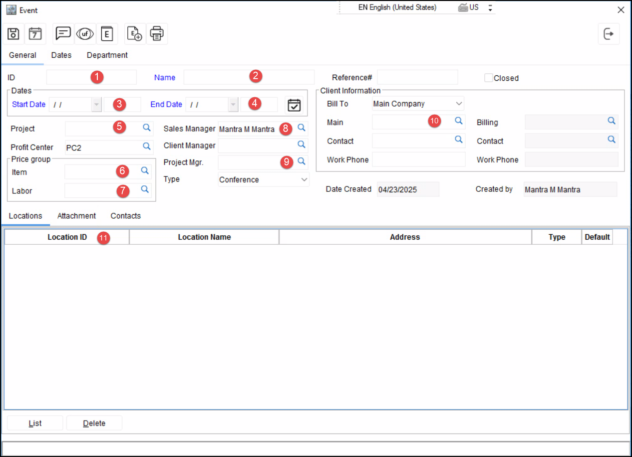 Main Company along with Main Contact Name, Billing Company and Billing Contact.
