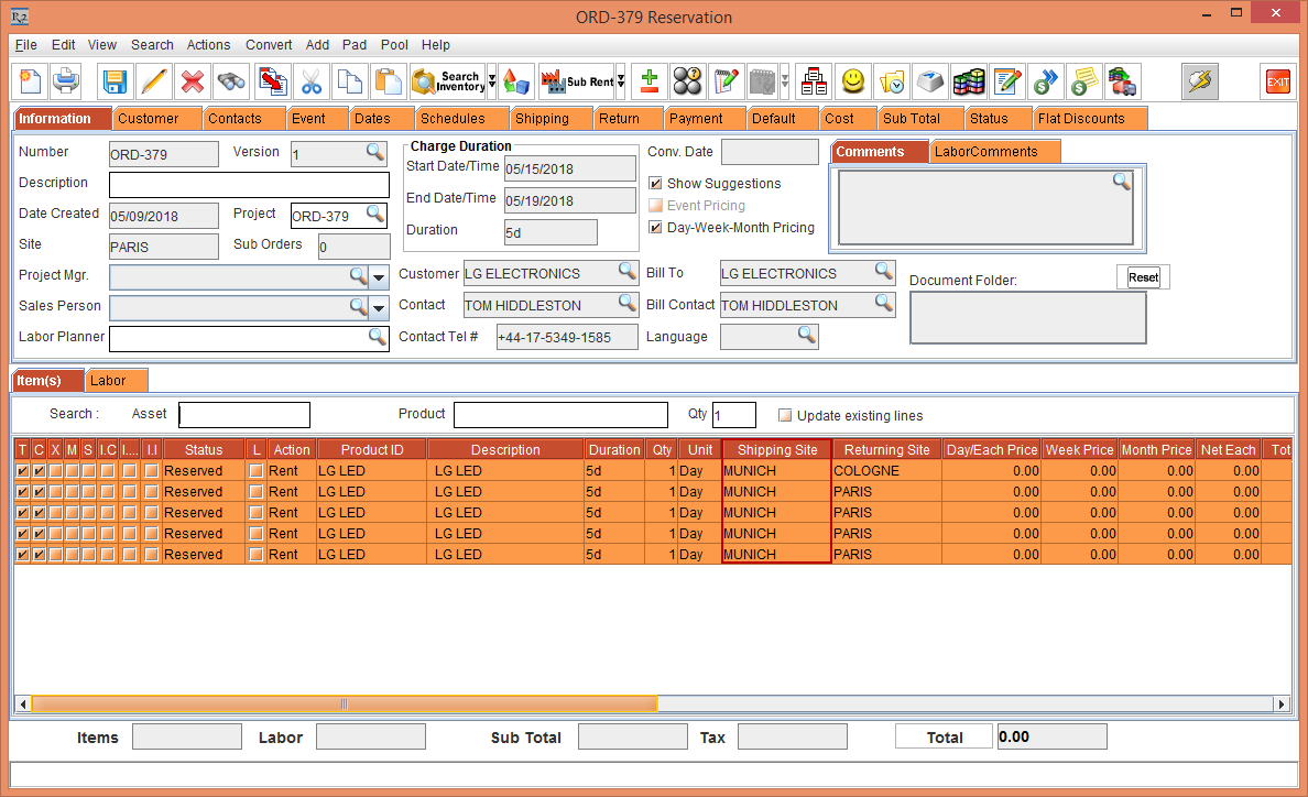 Figure 4.17 Left-click on the Order Line Time Bar of the Item [LG PC] > Tool Tip is displayed showing the Returning Site Name: PARIS