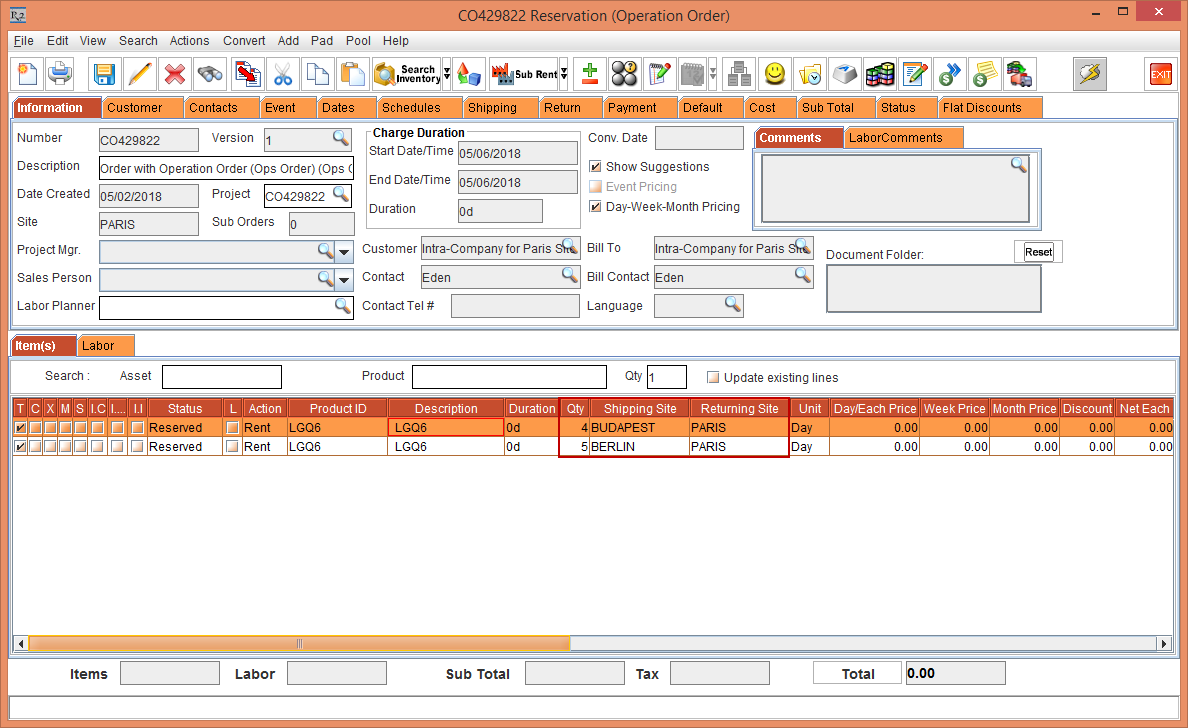 The EDR print will have details of the Shipping Site and Returning Site present in the Order.