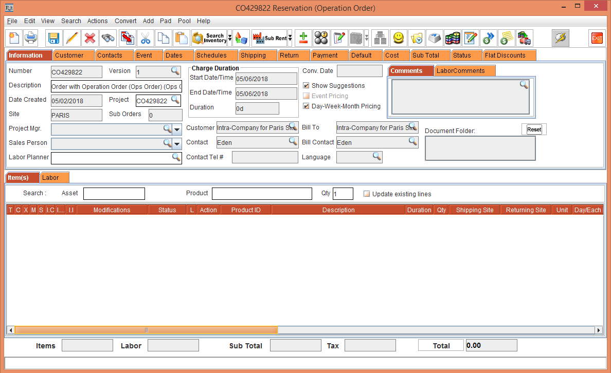 6. Create a Rental Reservation Order [ORD-379] for 5 days duration with the Start Date [15-May-2018], Start Time [09:00 AM] and End Date [19-May-2018]  End Time [09:00 AM]. Click the Search Item icon. The Search Items window is displayed.