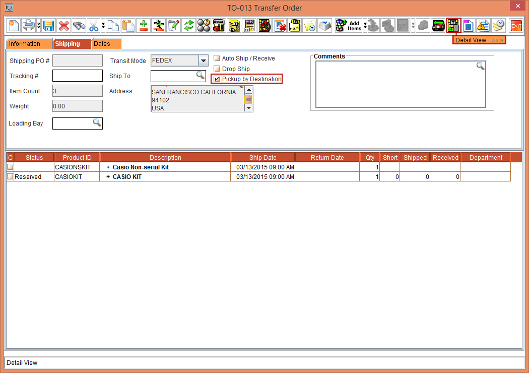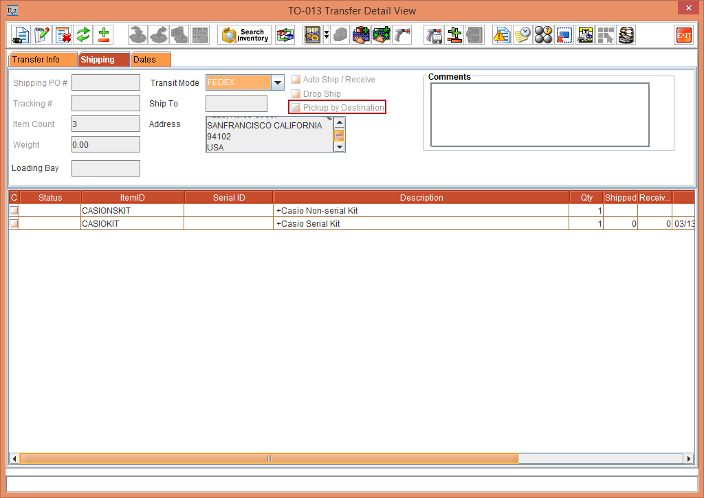 2. Select the Shipping tab. The Pickup by Destination check box is reflected in the Shipping tab of the TO-013 Transfer Detail View window, as shown in Figure1.1.
