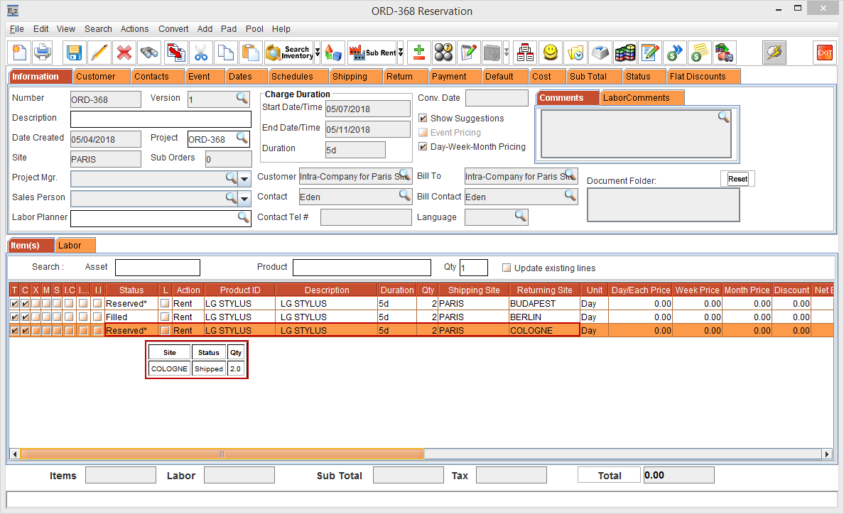 Similarly, when a Sub-Rent for the Item is preformed the Purchase Order for the Shipping Site [BUDAPEST] is created displaying the Site [BUDAPEST] and modifying the Item line Status in the Order [ORD-359] to S-Assign. Also, when a Transfer In for the Item is preformed the Transfer Order for the Shipping Site [BERLIN] is created displaying the Site [BERLIN] and modifying the Item line Status in the Order [ORD-359] to T-Reserved, as shown in Figure 4.7.