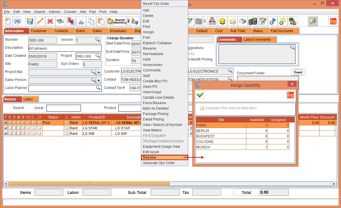 Select the Item line [LG LED] > right-click the > Resolve option. The Assign Quantity window is displayed with the stock Available at the Sites [BERLIN], [BUDAPEST], and [PARIS].