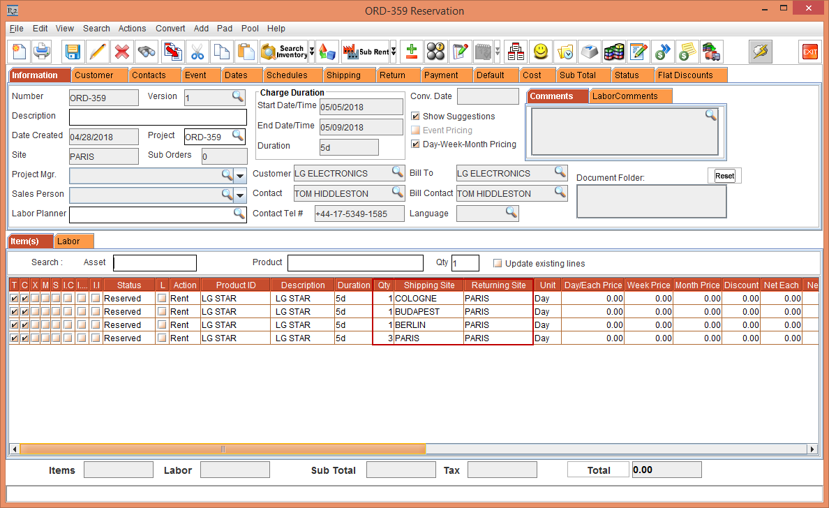 The Item line [LG LED] gets split into four lines in which three of the Item lines Status is displayed as [Reserved] with the Shipping Site displayed as Sites [BERLIN], [BUDAPEST], and [PARIS] respectively. The Returning Site for all the three Item lines is displayed as the Order Site [PARIS], as shown in Figure 4.8.