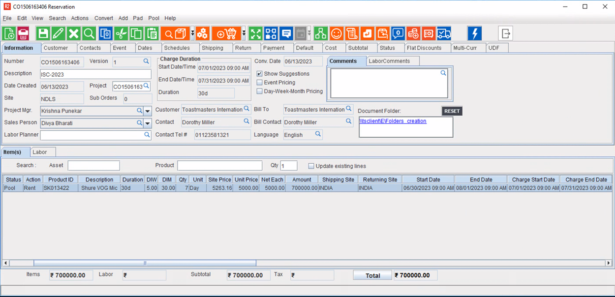 1. The Serial Item [Shure VOG Mic] is Reserved and distributed to the Sites [Bangalore], [Chennai], [Hyderabad], [Kolkata], [Mumbai], [New Delhi], and [Pune], with the Returning Site as the Order Site [New Delhi].
